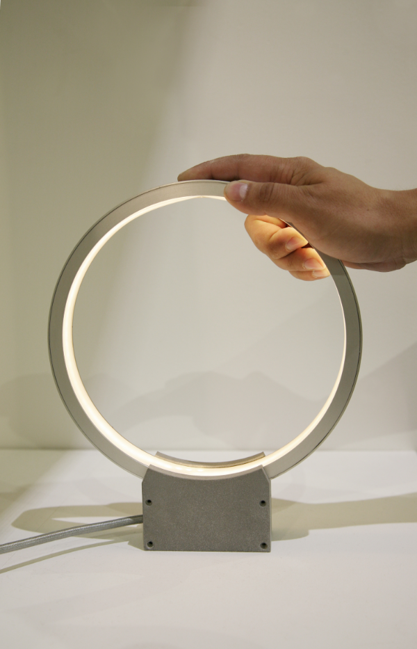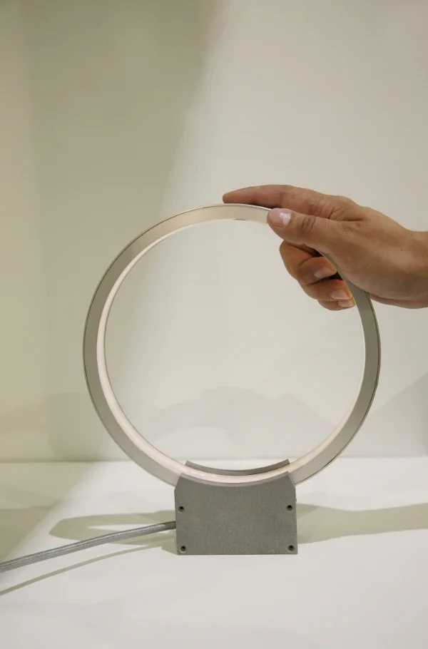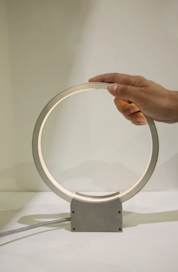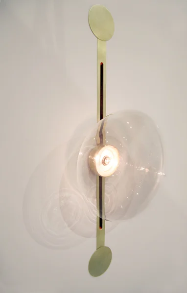 The lamp consists of a light source built into the wall which illuminates a metal plate that functions as a mirror. The metal plate is bent in such a way that it creates a pattern of reflection reminiscent of the refraction of light passing through water. The metal plate is attached to the light source but can be rotate 360 degrees. To give the lamp a more sophisticated appearance the metal is polished to chrome plated.